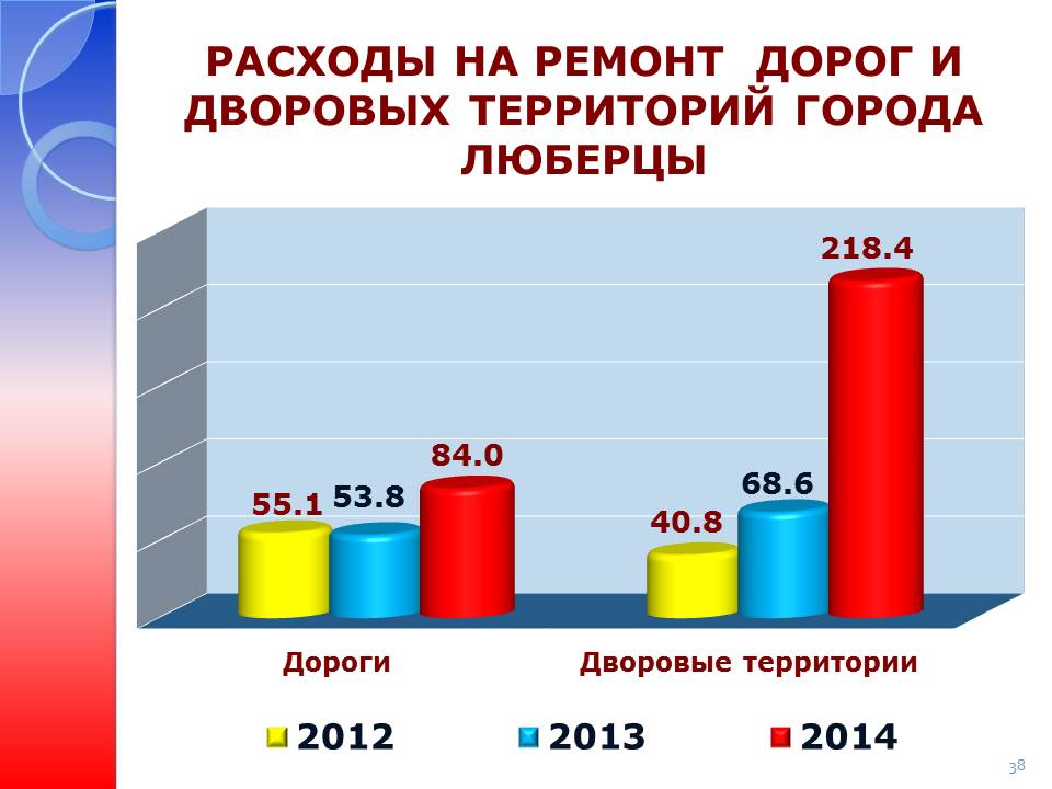 В 2014 году на дорожное хозяйство и благоустройство г. Люберцы было израсходовано 652,5 млн. руб. Это 61 % городского бюджета. Кроме того, на эти же цели была оказана финансовая помощь из бюджета области в сумме 103млн. руб.