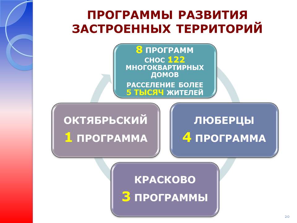 В районе принято 8 муниципальных адресных программ реконструкции и развития застроенных территорий, из них 4 – в городе, 3 – в Красково и 1 – в Октябрьском. Реализация этих программ позволит снести 122 многоквартирных дома с расселением более 5 тыс. человек и к 2020 году решить проблему ветхого жилья в районе.