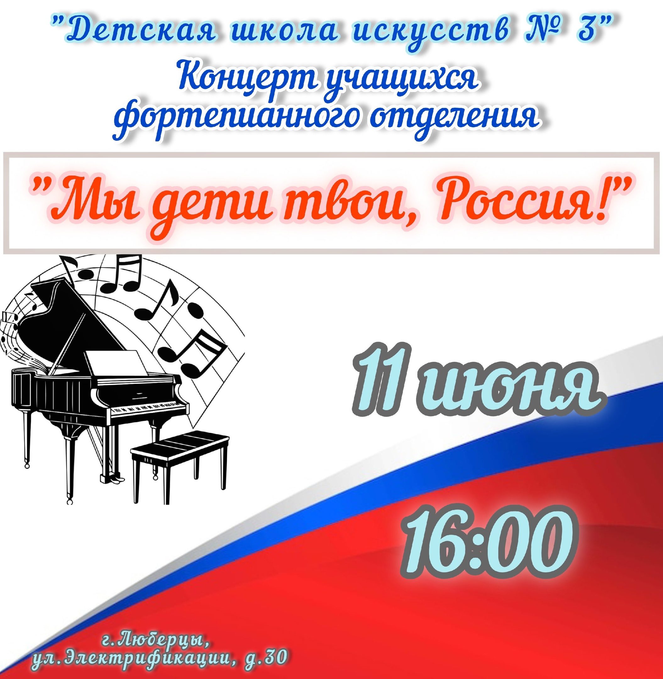 Концерт, посвященный празднованию Дня России, пройдет в детской школе искусств №3 (г. Люберцы, ул. Электрификации, д.30) во вторник, 11 июня.