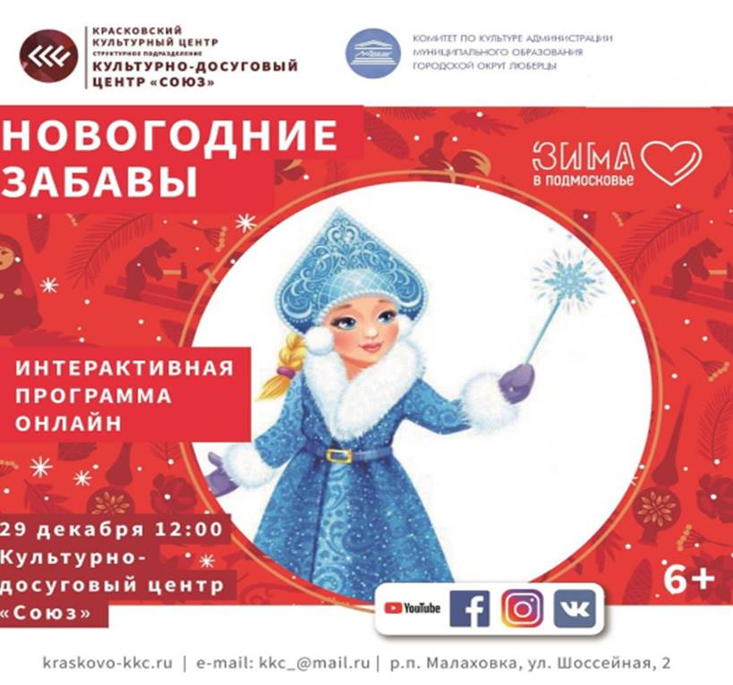 Во вторник, 29 декабря, КДЦ «Союз» приглашает люберчан на онлайн-мероприятия: