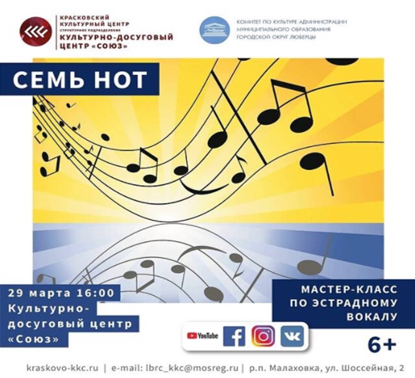 16:00 «Семь нот» - мастер-класс по эстрадному вокалу. Мероприятие пройдет по адресу: п. Малаховка, ул. Шоссейная, д.2. Вход по предварительной записи, тел. 8 (495) 501-41-88.