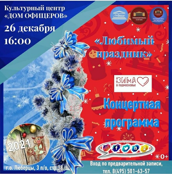 В субботу, 26 декабря, культурный центр «Дом офицеров» приглашает люберчан на концертную программу «Любимый праздник». Начало в 16:00.