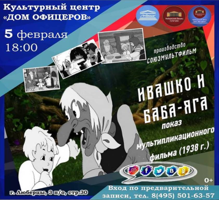 В пятницу, 5 февраля, культурный центр «Дом офицеров» приглашает юных люберчан на показ мультипликационного фильма «Ивашко и Баба Яга». Начало в 18:00.