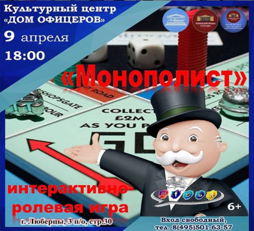 В пятницу, 9 апреля, культурный центр «Дом офицеров» приглашает юных люберчан на игровую программу «Монополист». Начало в 18:00.