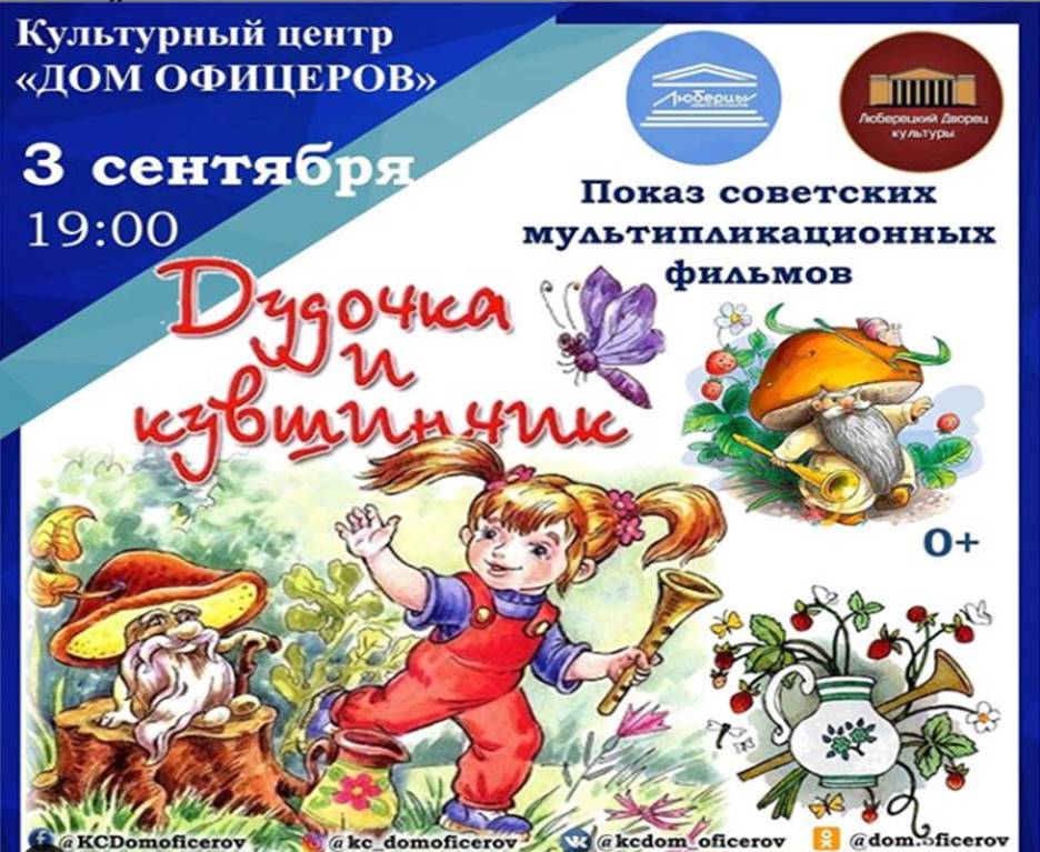 В четверг, 3 сентября, культурный центр «Дом офицеров» приглашает юных люберчан на показ мультипликационного фильма «Дудочка и кувшинчик». Начало в 19:00.