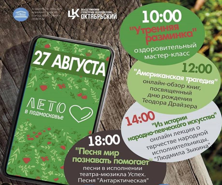 В четверг, 27 августа, культурный центр Октябрьский приглашает люберчан на онлайн-мероприятия: