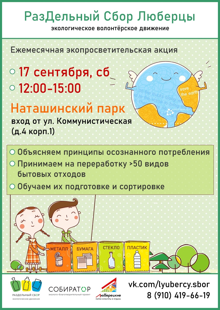 В парке «Наташинские пруды» городского округа Люберцы 17 сентября пройдет акция по раздельному сбору мусора, жители смогут сдать вторсырье, сообщили в экологическом волонтерском движении «РазДельный Сбор Люберцы».