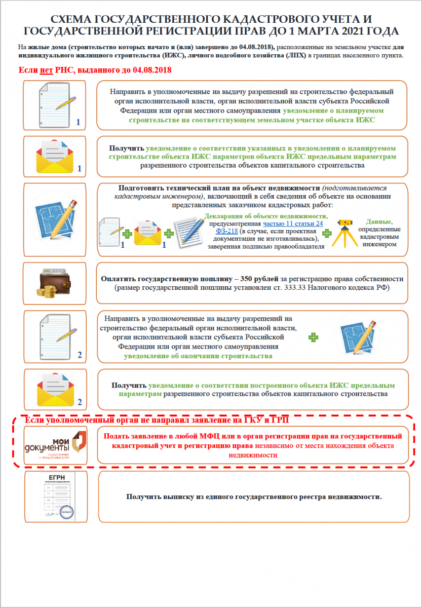 Важно! Законом предусмотрена возможность до 1 марта 2021 года регистрации уже построенных домов и домов, строительство которых начато до 4 августа 2018 года без разрешительных документов, в том числе на земельных участках, предназначенных для ведения индивидуального жилищного строительства (ИЖС) и личного подсобного хозяйства (ЛПХ) в границах населенных пунктов.
