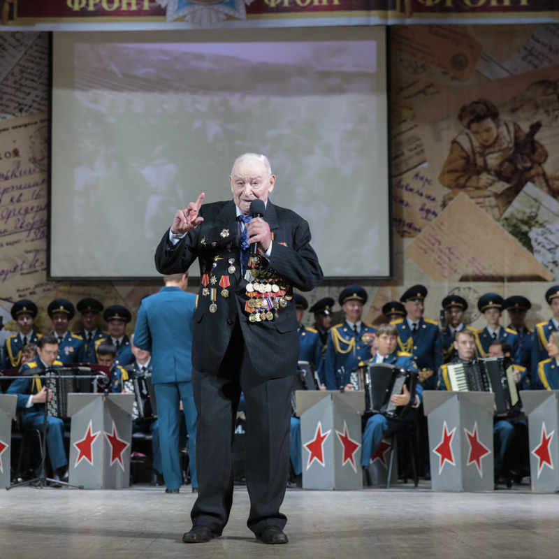 Открыло концерт выступление участника ВОВ, военного лётчика, председателя Совета ветеранов г.п. Красково Георгия Новикова, который исполнил «Песенку фронтового шофёра».