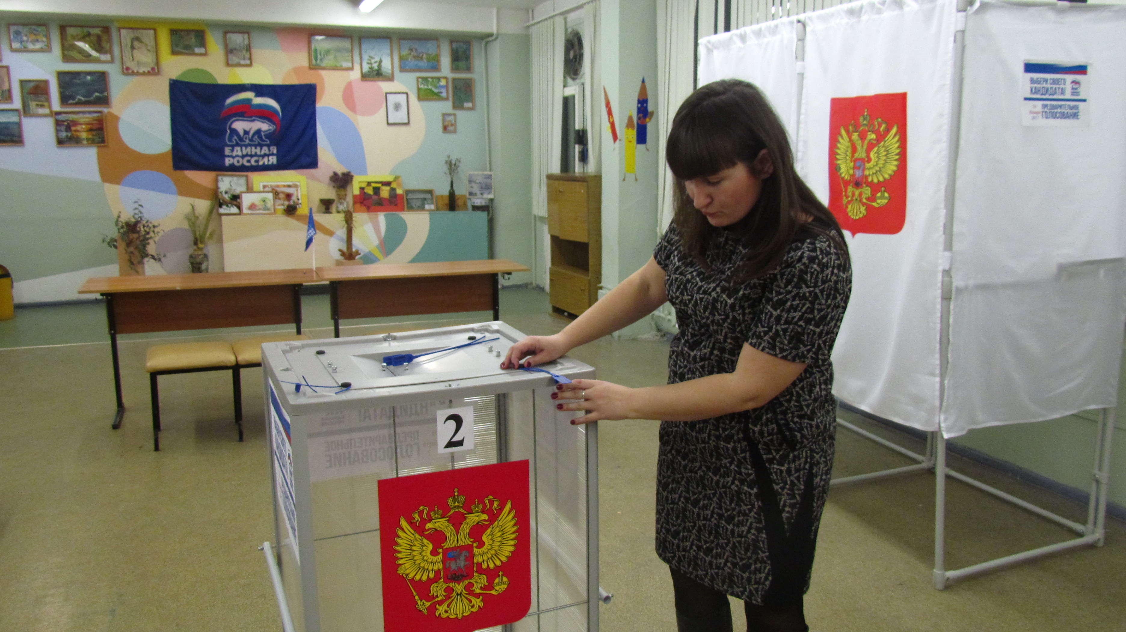 В 8.00 был открыт участок предварительного голосования №7, расположенный в школе № 53. Предварительно председателем счетной комиссии была опечатана урна для голосования. На участке представлены информационные материалы и партийная символика.