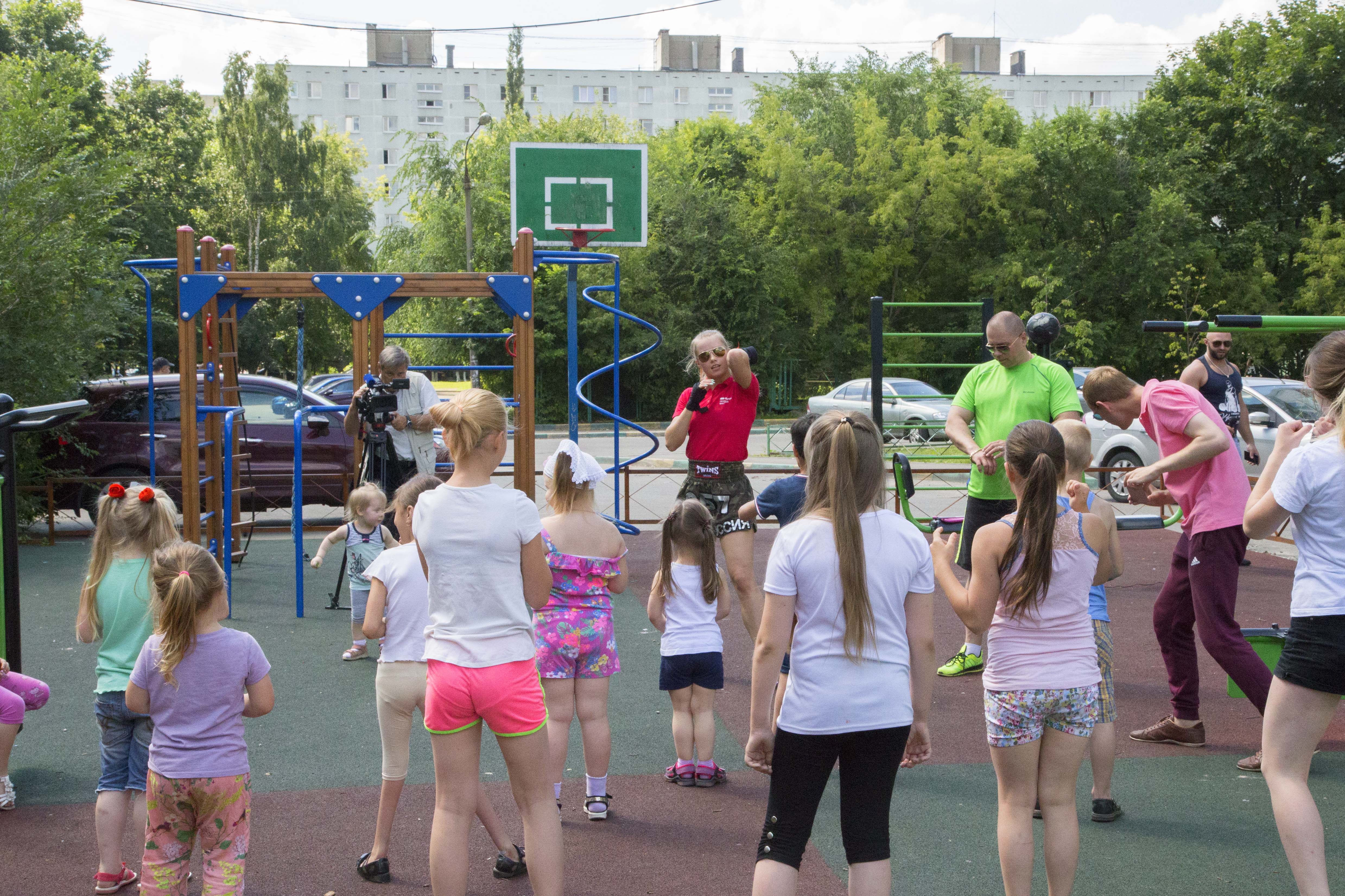 Во дворе дома № 11 на Комсомольском проспекте для всех желающих тренеры военно-патриотической организации «Русский лад» и клуба «Территория Фитнеса» провели открытую тренировку по ОФП, тайскому боксу, а также показательные выступления артистов силового шоу.