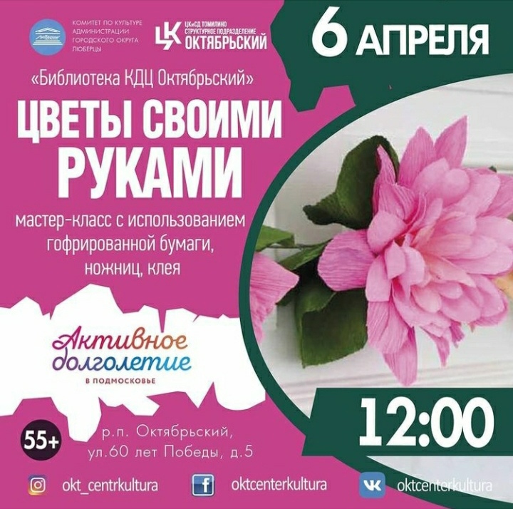 Во вторник, 6 апреля, библиотека культурно-досугового центра Октябрьский приглашает люберчан старшего возраста на мастер-класс «Цветы своими руками». Начало в 12:00.