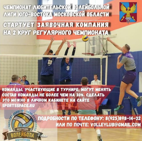 «Федерация волейбола городского округа Люберцы объявляет о старте заявочной кампании на участие во втором круге регулярного чемпионата любительской волейбольной лиги юго-востока. Подробная информация - по телефону 8(925) 898-14-32 или по почте volleylub@gmail.com», - отметили в комитете.