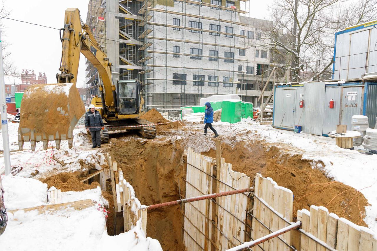 «Большой фронт работ связан с проведением коммуникаций. Работы ведем на глубине пяти метров. Осталось выполнить 40 % теплотрассы непосредственно к зданию. Это сложный и трудоемкий процесс, потому что рядом плотная городская застройка», - отметил старший прораб генподрядной организации Алексей Жур.
