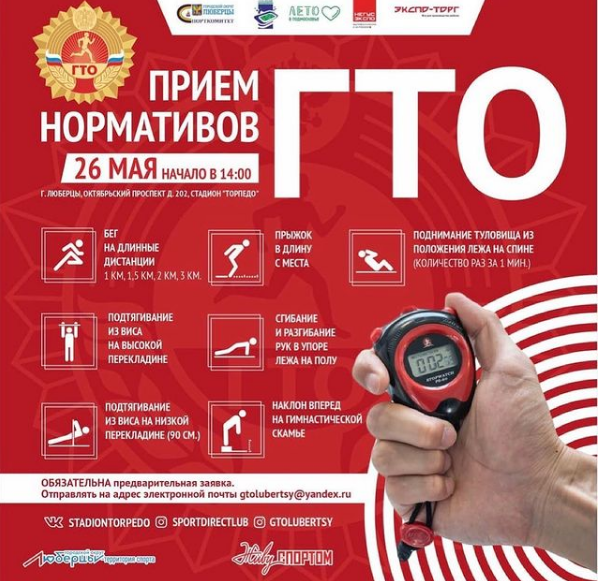На стадионе «Торпедо» Люберец 26 мая горожане смогут выполнить нормативы комплекса «Готов к труду и обороне» по видам, сообщили в комитете по физической культуре, спорту и туризму администрации муниципалитета.
