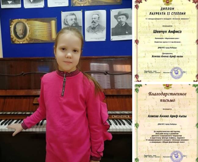 Ученица детской музыкальной школы №2 Анфиса Шевчук стала лауреатом II степени международного музыкального конкурса «Осенняя мозаика». Об этом рассказал глава городского округа Люберцы Владимир Ружицкий.