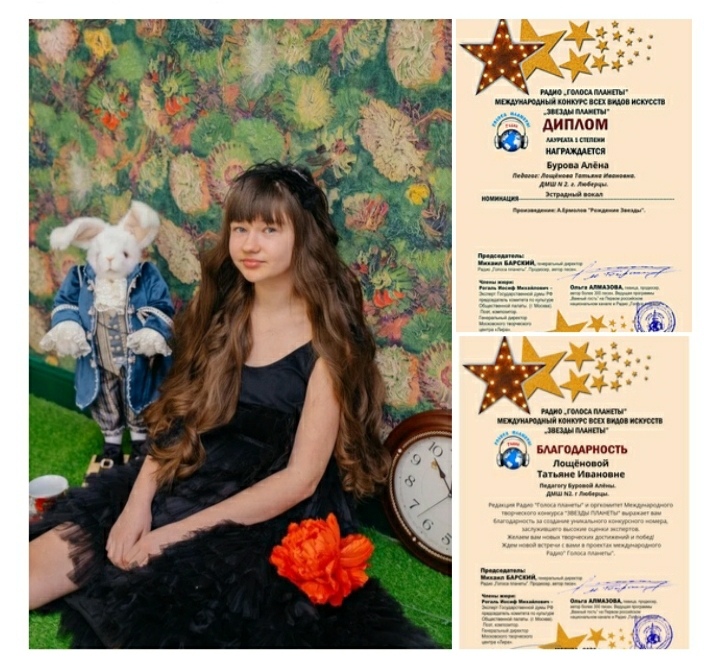 Ученица детской музыкальной школы №2 Алёна Бурова стала лауреатом I степени Международного конкурса всех видов искусств «Звезды Планеты». Об этом рассказал глава городского округа Люберцы Владимир Ружицкий.
