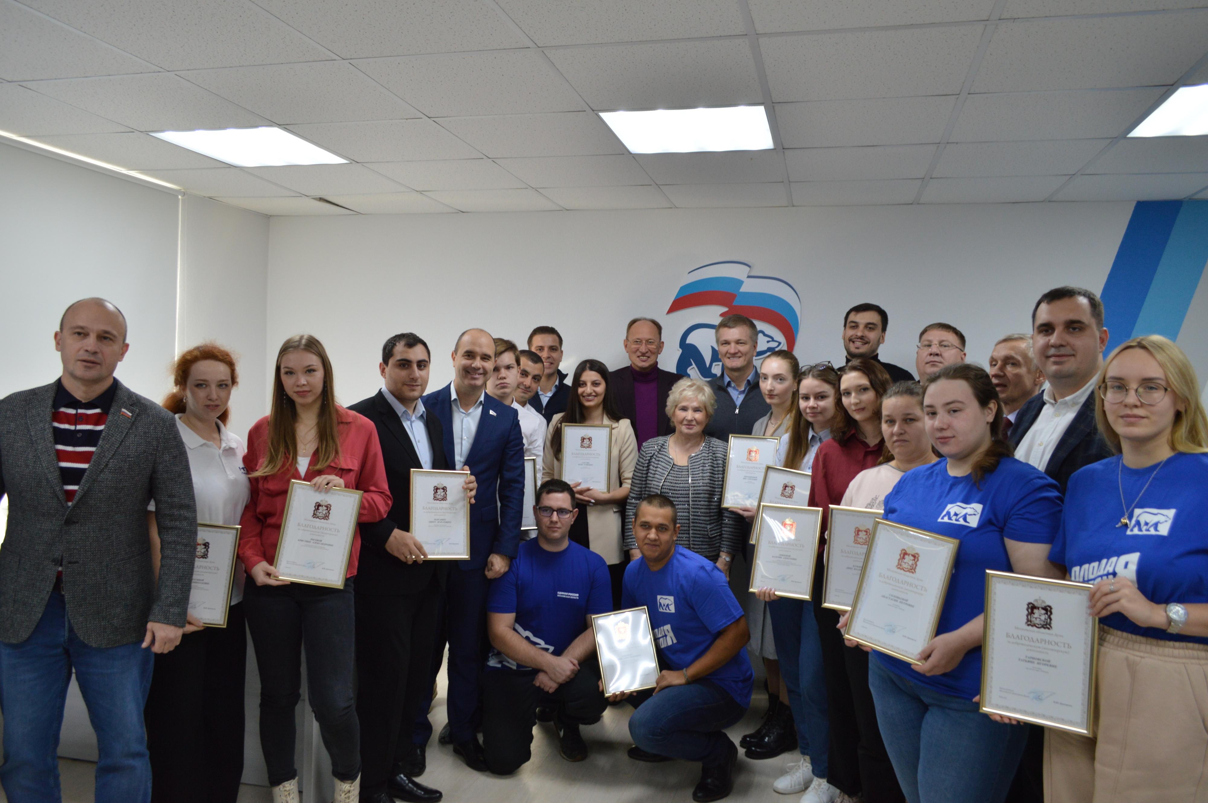 В отделении «Единой России» городского округа Люберцы депутаты от партии в Мособлдуме, члены молодежного парламента и местные депутаты поздравили волонтеров с Днем добровольца Подмосковья и вручили им благодарственные грамоты.