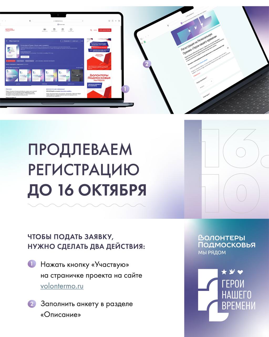 Премия «Герои нашего времени» проводится при поддержке Росмолодёжи, Министерства информационных и социальных коммуникаций Московской области, а также регионального движения «Волонтеры Подмосковья».
