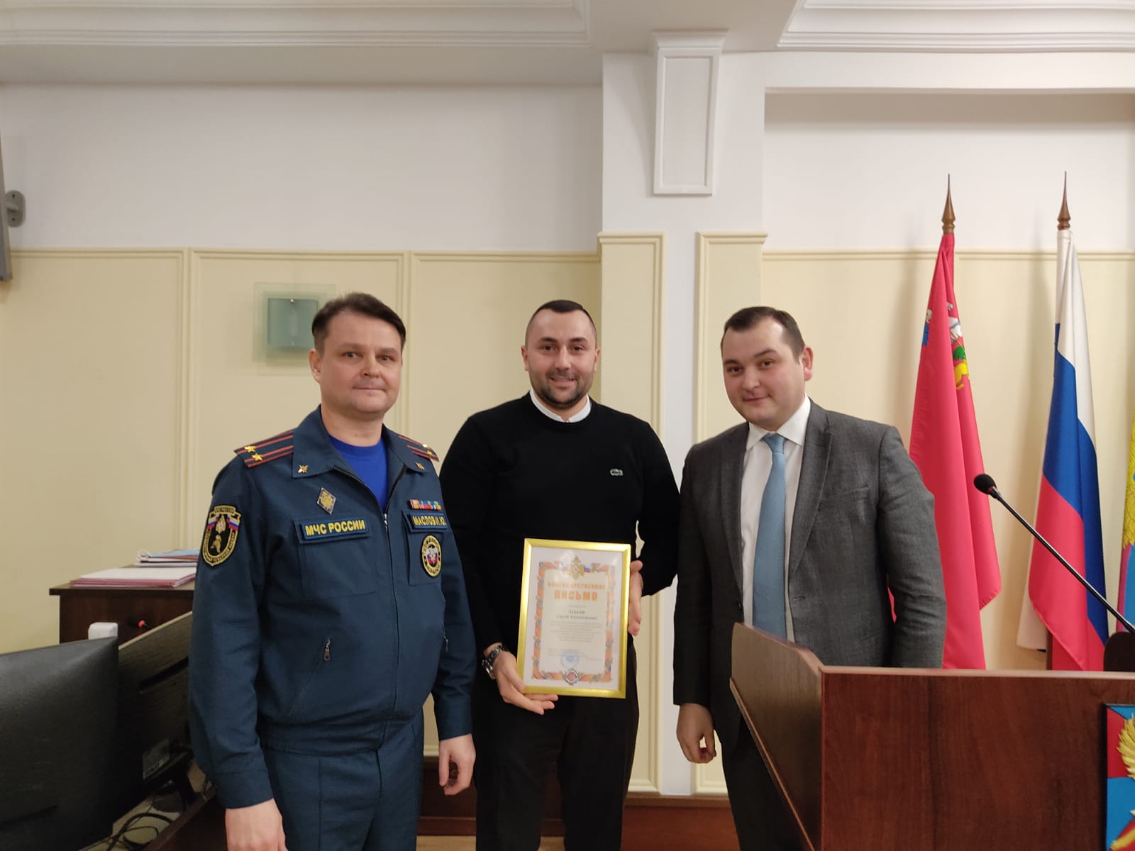 Представителю Общественной палаты городского округа Люберцы Сергею Зубкову вручили благодарность начальника ГУ МЧС России по Московской области, генерал-лейтенанта Сергея Полетыкина. Вручение провел заместитель главы администрации муниципалитета Михаил Криворучко.