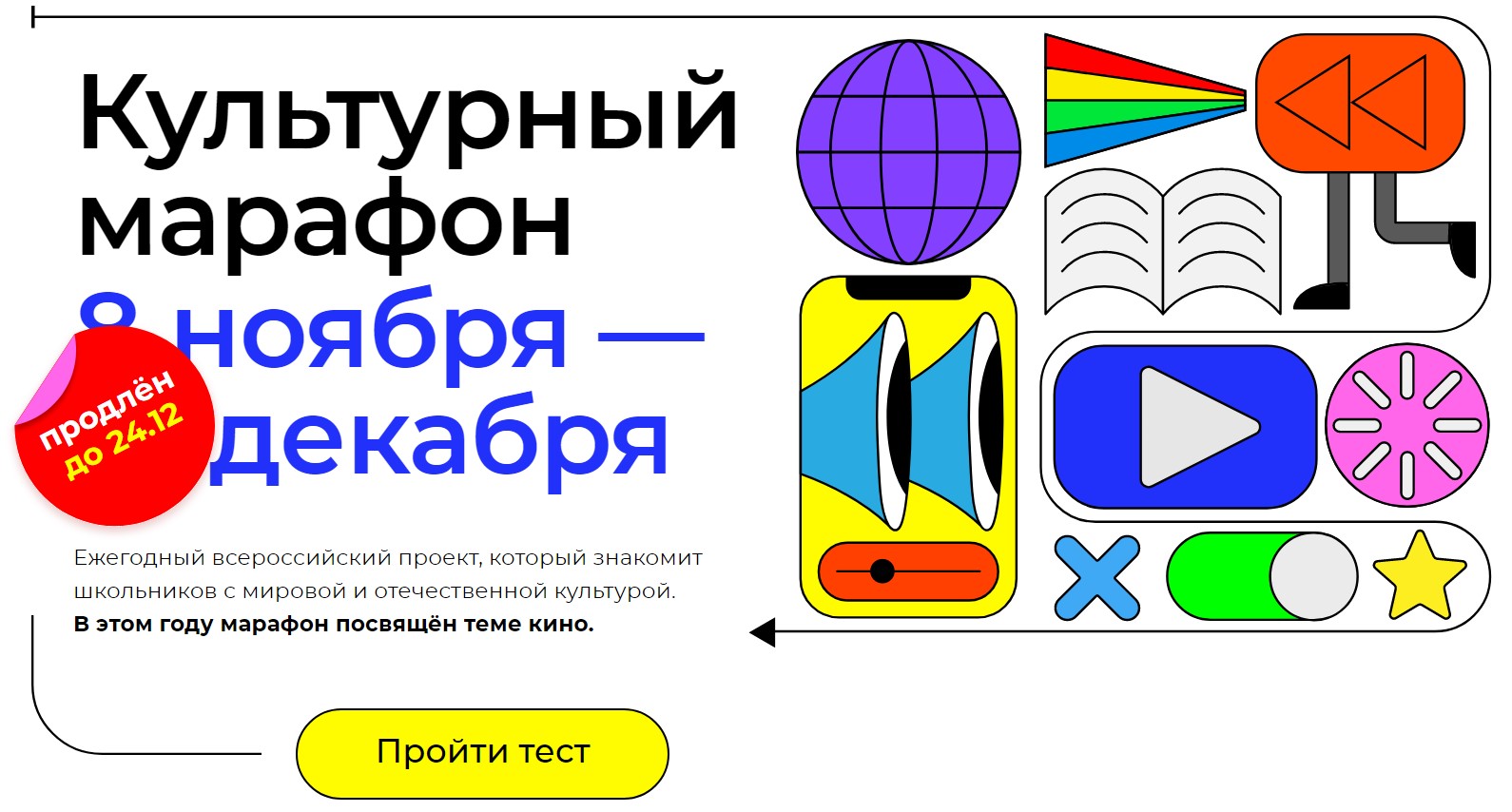 «Ежегодная Всероссийская акция «Культурный марафон» стартовала 8 ноября. По многочисленным заявкам организаторами марафона принято решение продлить мероприятие до 24 декабря. В акции могут принять участие учителя, школьники и их родители. В этом году акция приурочена к 125-летию со дня проведения первого киносеанса. Интерактивные задания, адаптированные для разных возрастных категорий, помогут участникам акции понять мир кино, работу режиссеров в части управления эмоциями зрителей и использования различных приемов. Пройти тест можно на сайте проекта», - отмечается в сообщении.