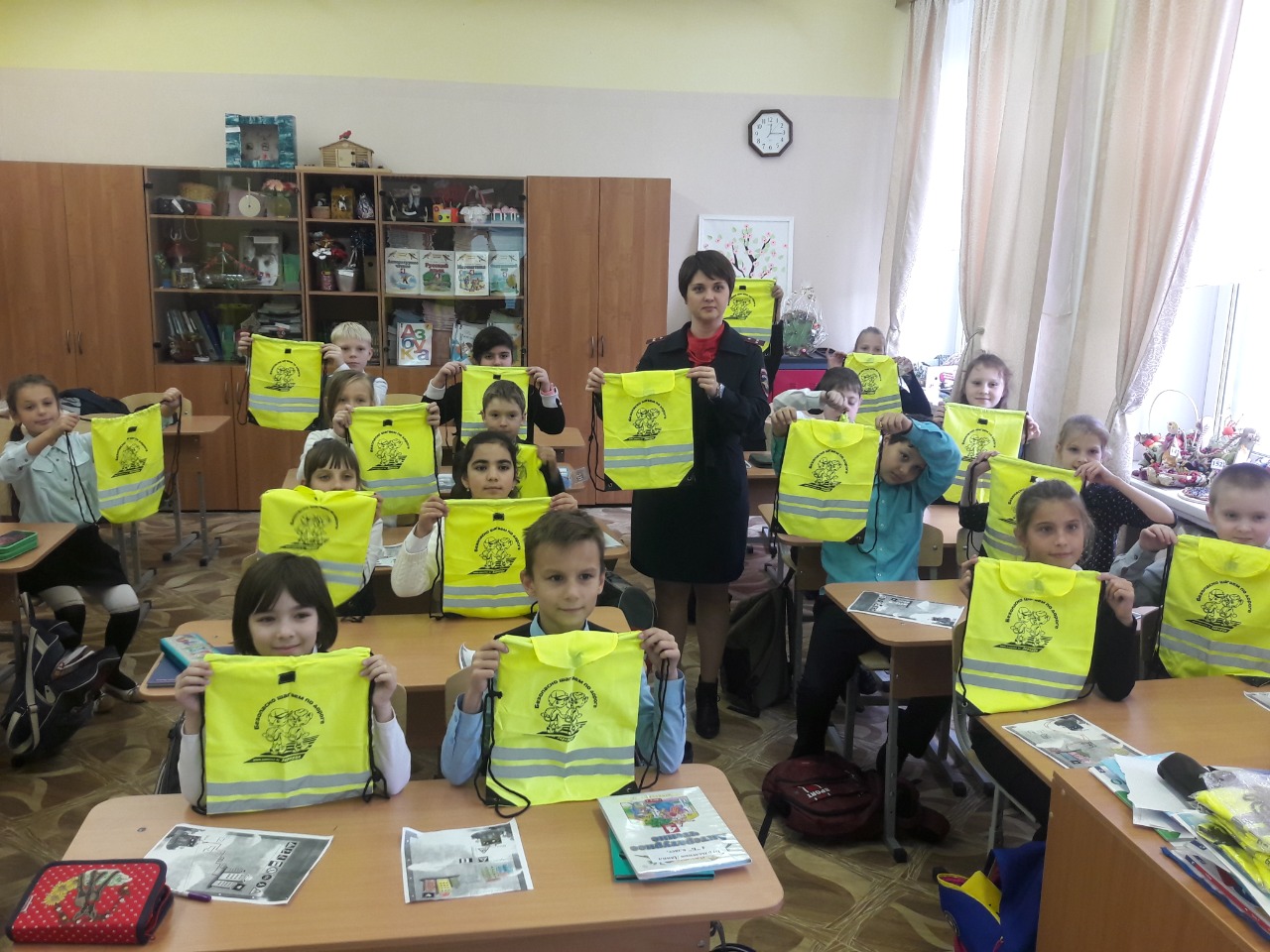 В завершении ученикам были вручены подарки от сотрудников полиции - сумочки со световозвращающими элементами, которые необходимо использовать при движении по улице в темное время суток.