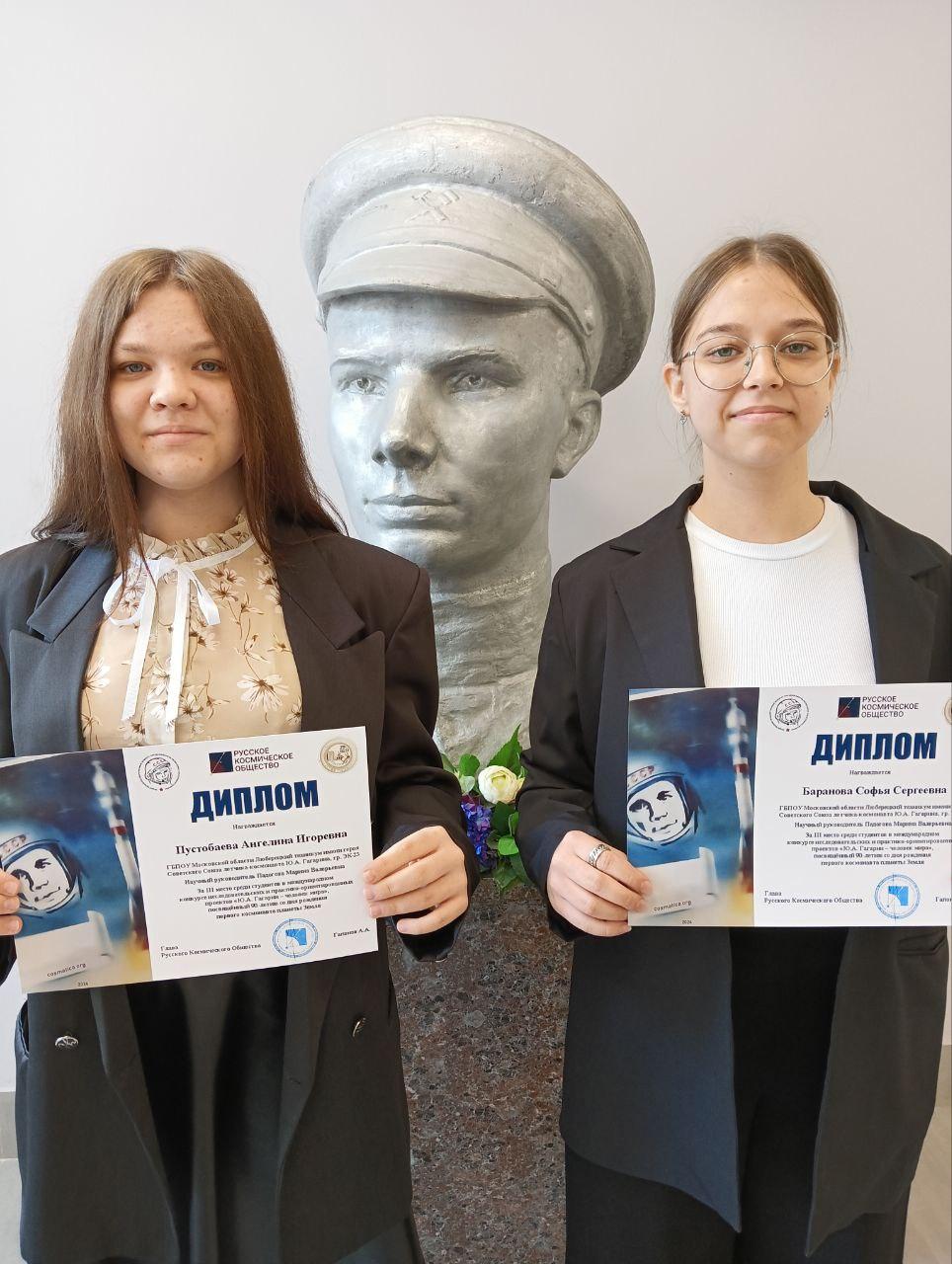 Подведены итоги международного конкурса на лучший исследовательский и практико-ориентированный проект на тему «Ю.А. Гагарин — человек мира». Сразу две работы студенток Люберецкого техникума имени Ю.А. Гагарина стали обладателями дипломов за третье место.