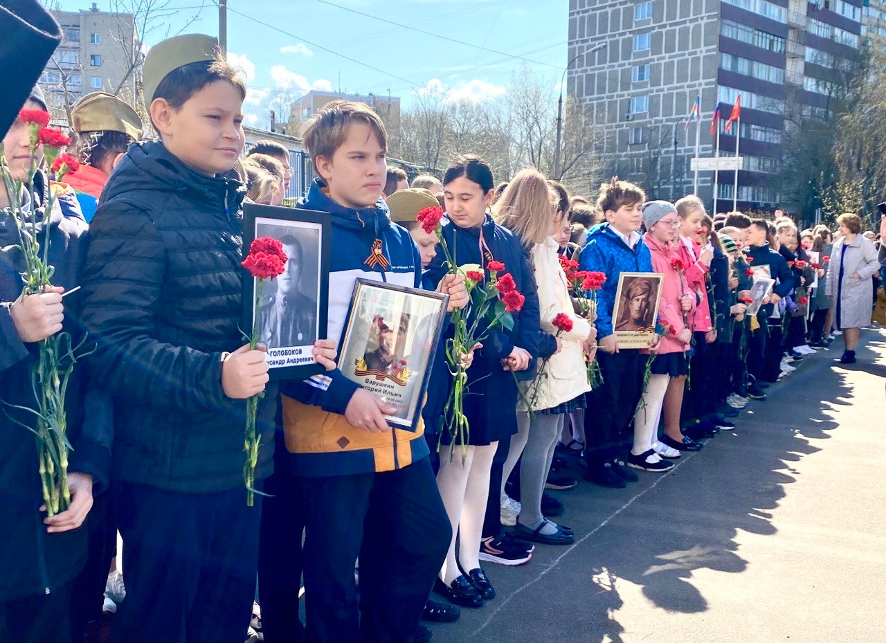 В честь предстоящего праздника он исполнил песню «День Победы». К школьной линейке присоединились жители близлежащих домов – из окон своих квартир протянули Знамёна Победы.