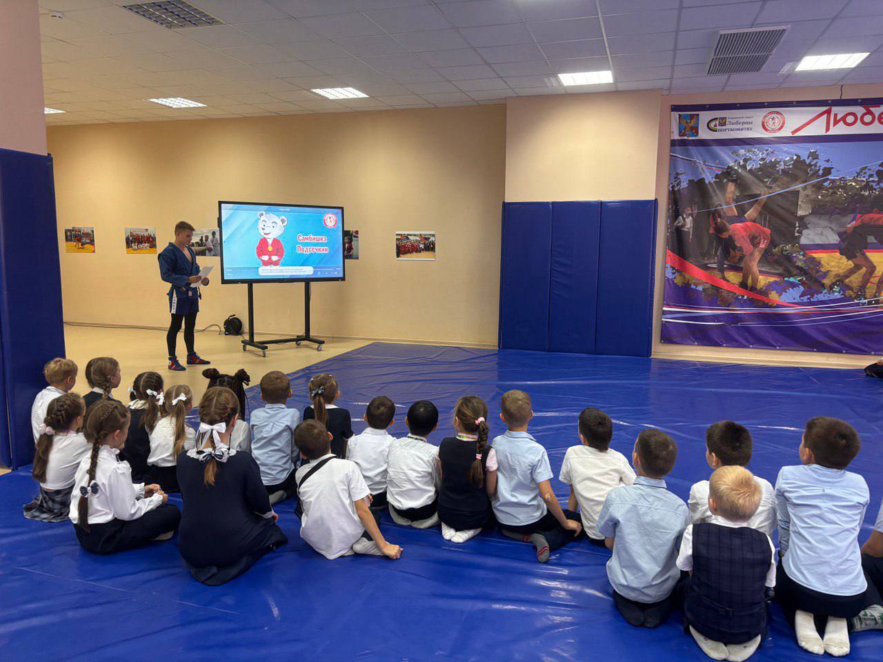 В рамках открытого урока тренеры Федерации – Алексей Шкоров и Данила Лебедев – рассказали учащимся об истории создания национального вида спорта самбо, основных особенностях борьбы, познакомили с талисманом люберецкой Федерации – белым медведем Самбишкой Подсечкиным. Имя талисману выбирали коллегиально - тренерским составом.