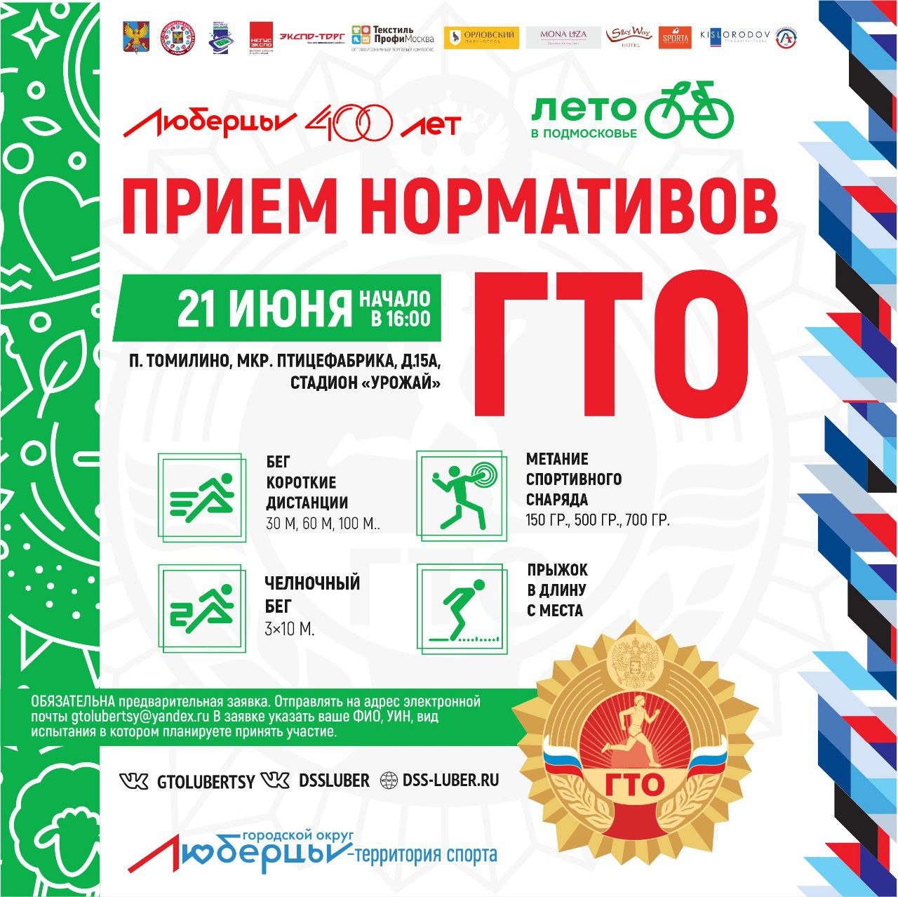 Он пояснил, что для выполнения нормативов обязательна предварительная заявка, которую нужно отправить на адрес: gtolubertsy@yandex.ru. В письме следует указать ФИО (полностью), УИН и нормативы, в которых будет приниматься участие, число или место приема норм ГТО. При себе необходимо иметь медицинскую справку, спортивную обувь и форму.