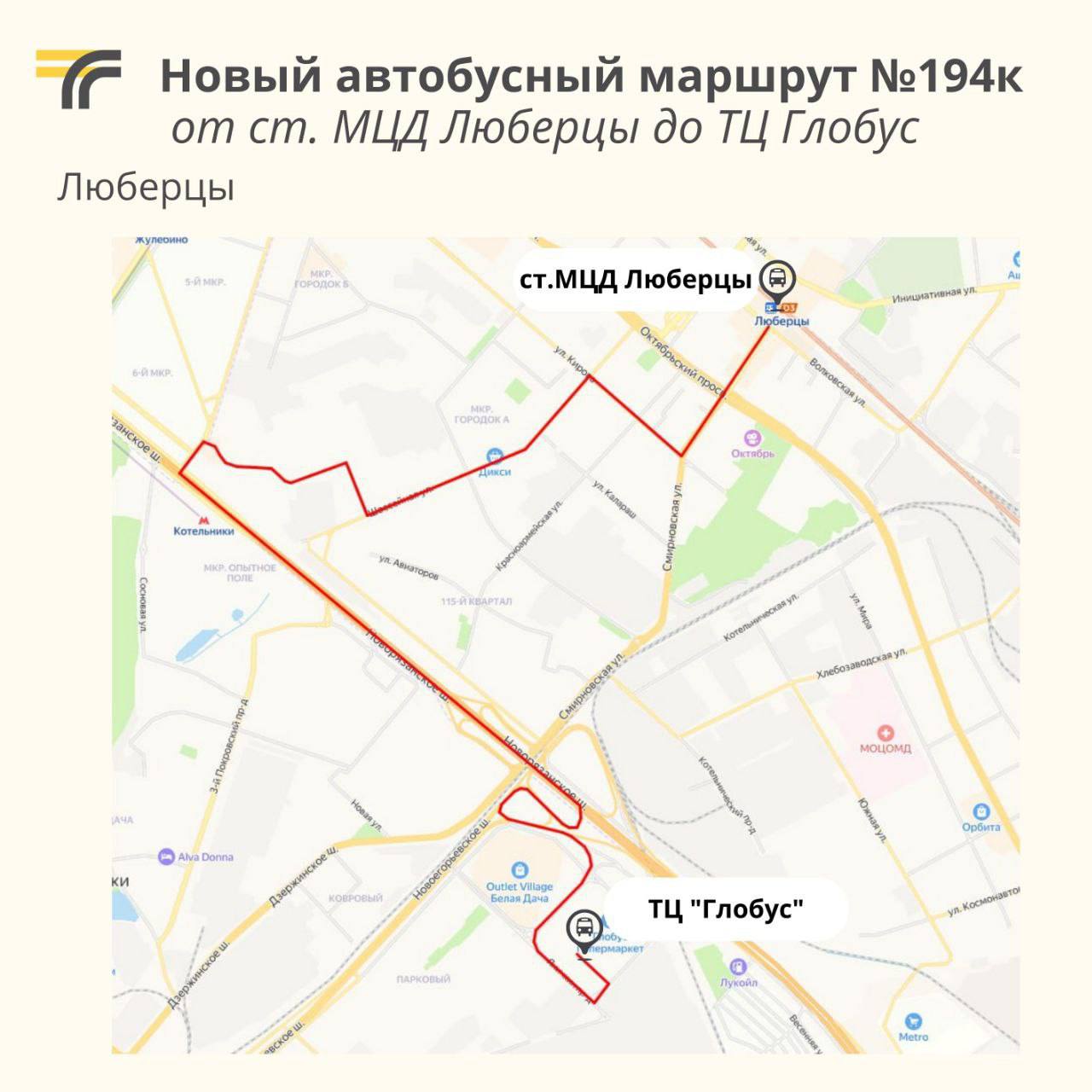 В городском округе Люберцы с 15 октября начнет работать новый автобусный маршрут №194к между станцией МЦД «Люберцы» и ТЦ «Глобус».