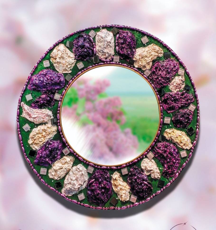 Художница превращает обычные зеркала в уникальные произведения искусства, используя сложную технику и разнообразные материалы. Её работы отличаются яркими цветами, оригинальными формами и широким сюжетным рядом.