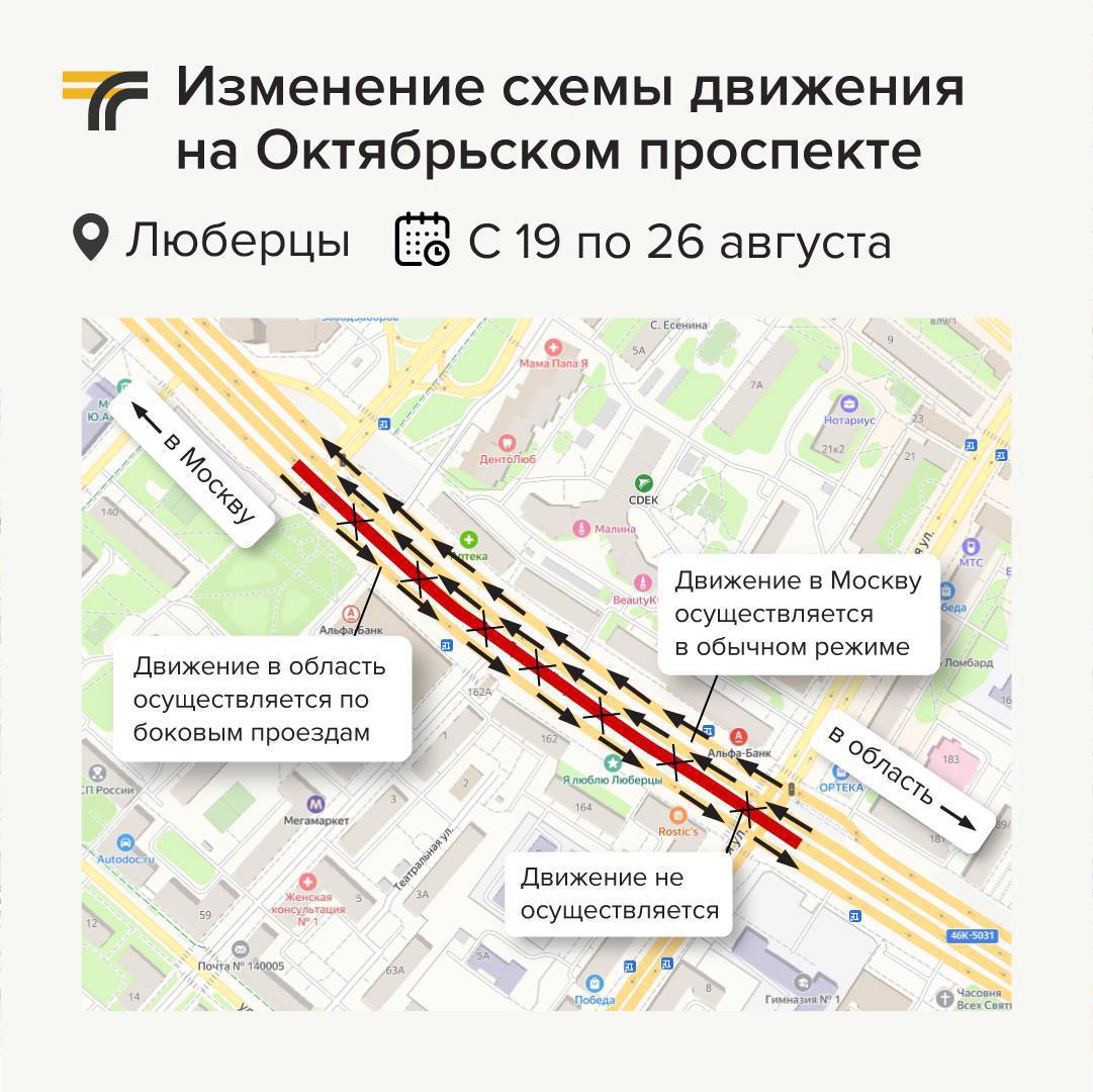 В городском округе Люберцы в рамках первого этапа реконструкции Октябрьского проспекта с 19 августа временно изменится схема движения транспорта, сообщили в пресс-службе Министерства транспорта и дорожной инфраструктуры Московской области.