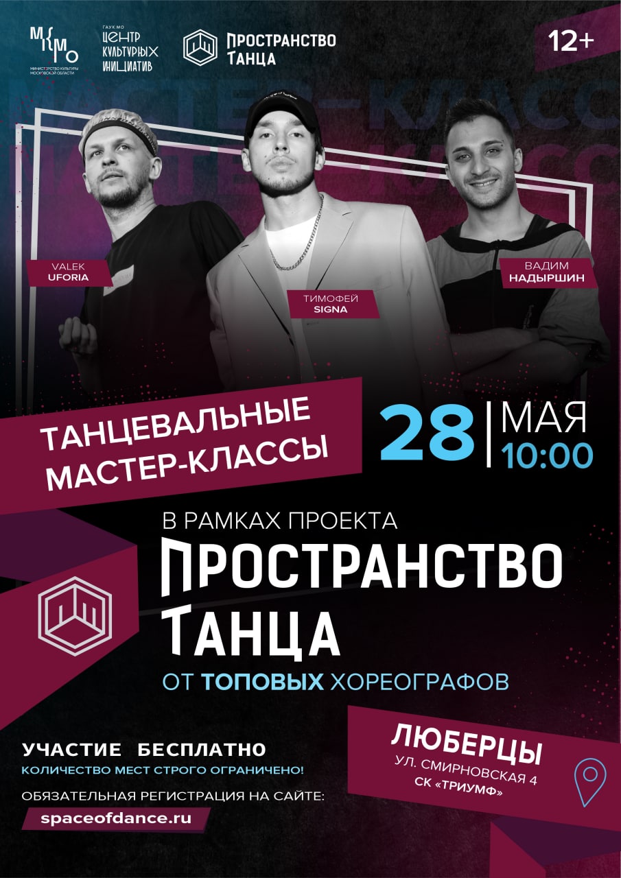 Четвертая серия мастер-классов в рамках проекта «Пространство танца» пройдет 28 мая в Люберцы, ДС «Триумф». Основной стиль классов - Electro, где приглашёнными педагогами станут Валентин Григорьев (Valek Uforia) и Тимофей Смирнов (Тимофей Signa). Участие абсолютно бесплатно! Регистрация на сайте обязательна: https://spaceofdance.ru/.