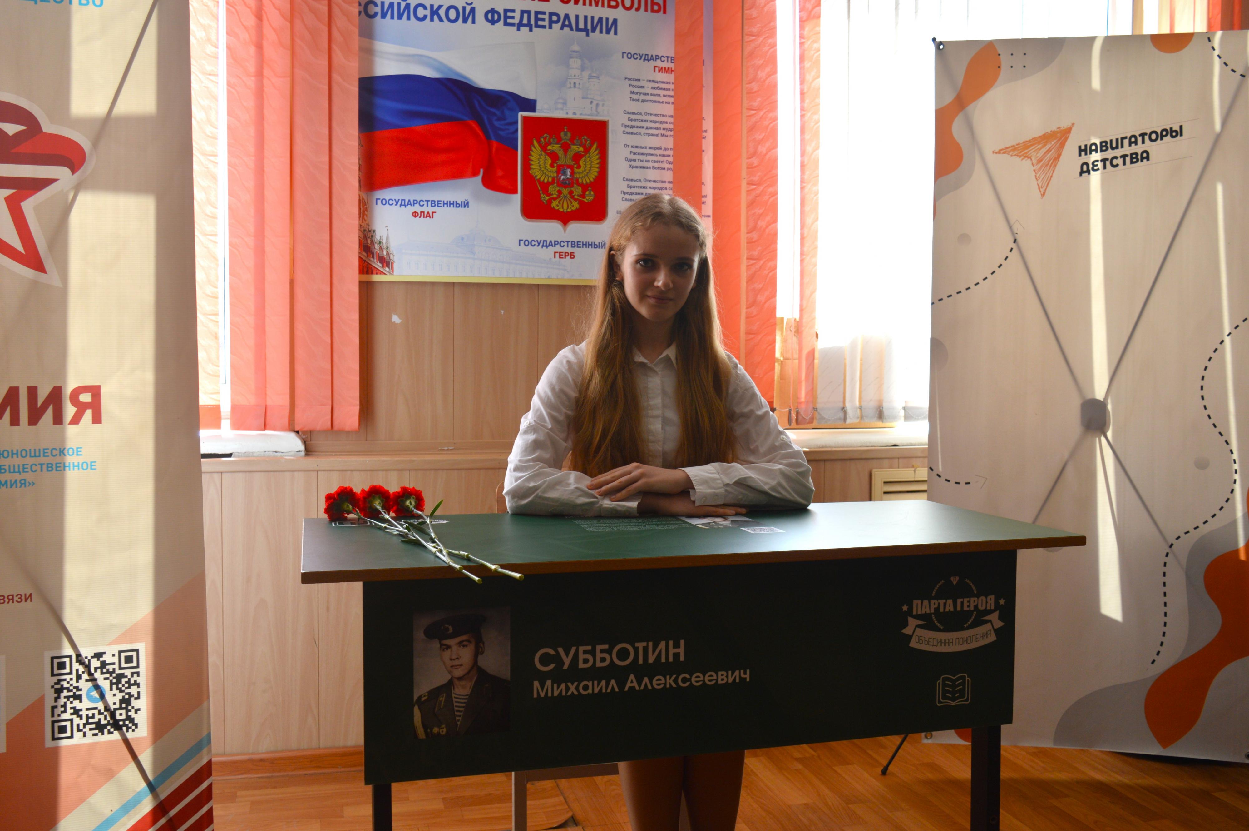 В пятницу в школе № 8 городского округа Люберцы установили Парту Героя в честь военнослужащего Михаила Субботина, сообщила председатель местного Совета сторонников «Единой России», заместитель председателя Совета депутатов муниципалитета Елена Верховых.