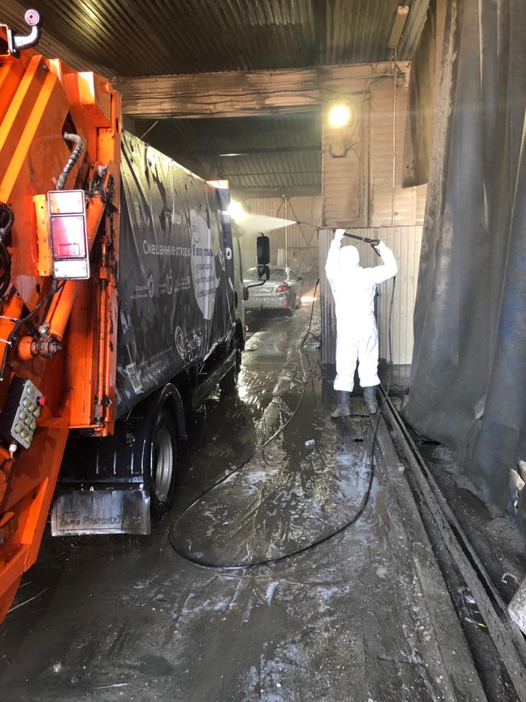 По словам Ружицкого, контейнеры и бункеры, которые попадают в ремонтную зону, также обеззараживают на пункте дезинфекции. В течение нескольких дней на маршрут в жилой сектор выйдет специальная передвижная мойка, которая будет обрабатывать баки прямо на контейнерной площадке – контейнеры загружаются в нее и весь процесс происходит внутри. В плане - обработать весь парк емкостей.