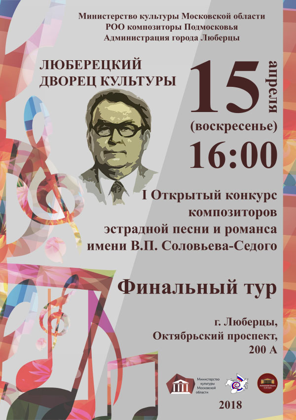 15 апреля в Люберецком районном дворце культуры пройдёт заключительный концерт лауреатов и участников 1-го композиторского открытого конкурса эстрадной песни и романса, посвящённый 110-летию со дня рождения советского композитора Василия Соловьёва-Седого.