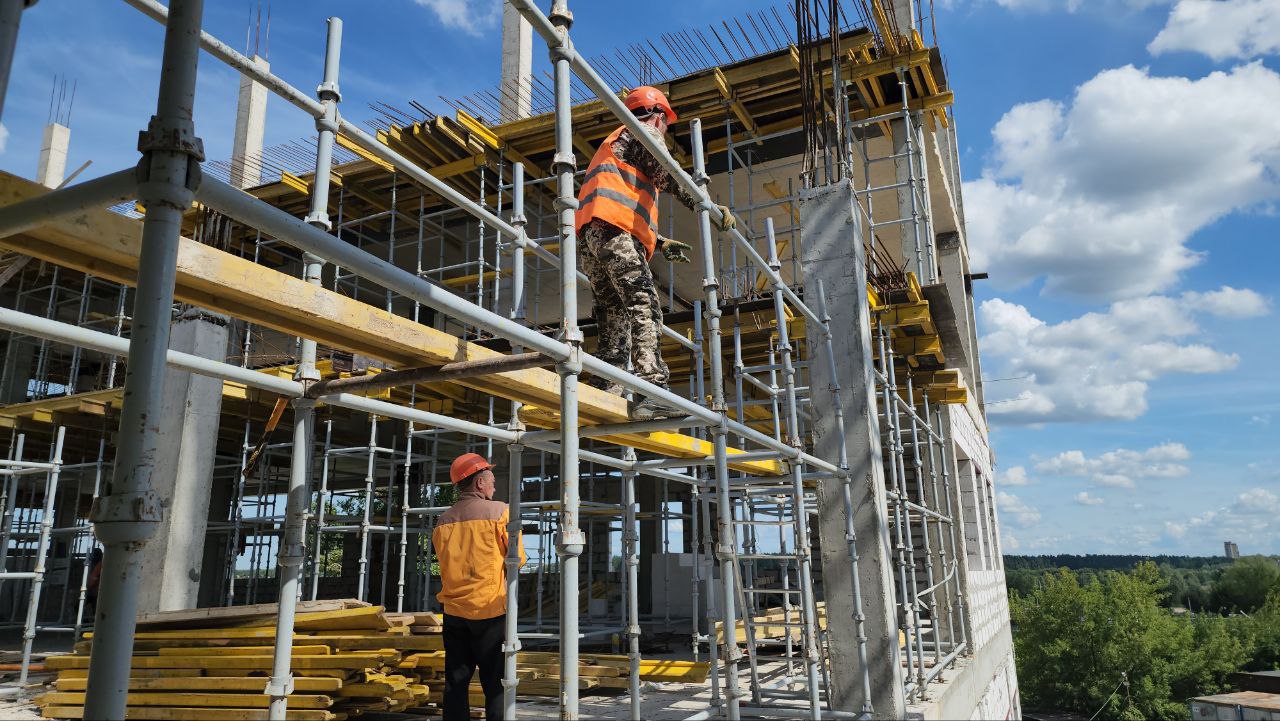 «На данный момент мы поднимаем перекрытия пятого этажа, выставляем опалубку, доделываем четвёртый этаж. Также вяжем каркас под тепловые сети. Помимо монолитных работ, выполняем каменную кладку наружных стен на втором и третьем этаже. На первом - согласно проекту будут стеклянные витражи, поэтому здесь предстоит выполнить только внутренние перегородки из пеноблока», - отметил старший прораб генподрядной организации Алексей Жур.