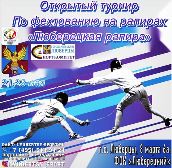 «Турнир «Люберецкая рапира» проводится в округе третий раз и уже стал традиционным. В нынешнем году он пройдет с 21 по 23 мая. Уже принято порядка 250 заявок от юных спортсменов из Москвы, Московской области и других регионов. Городской округ Люберцы представят 25 лучших рапиристов. Приглашаю всех желающих поддержать юных спортсменов!» - сказал Ружицкий.