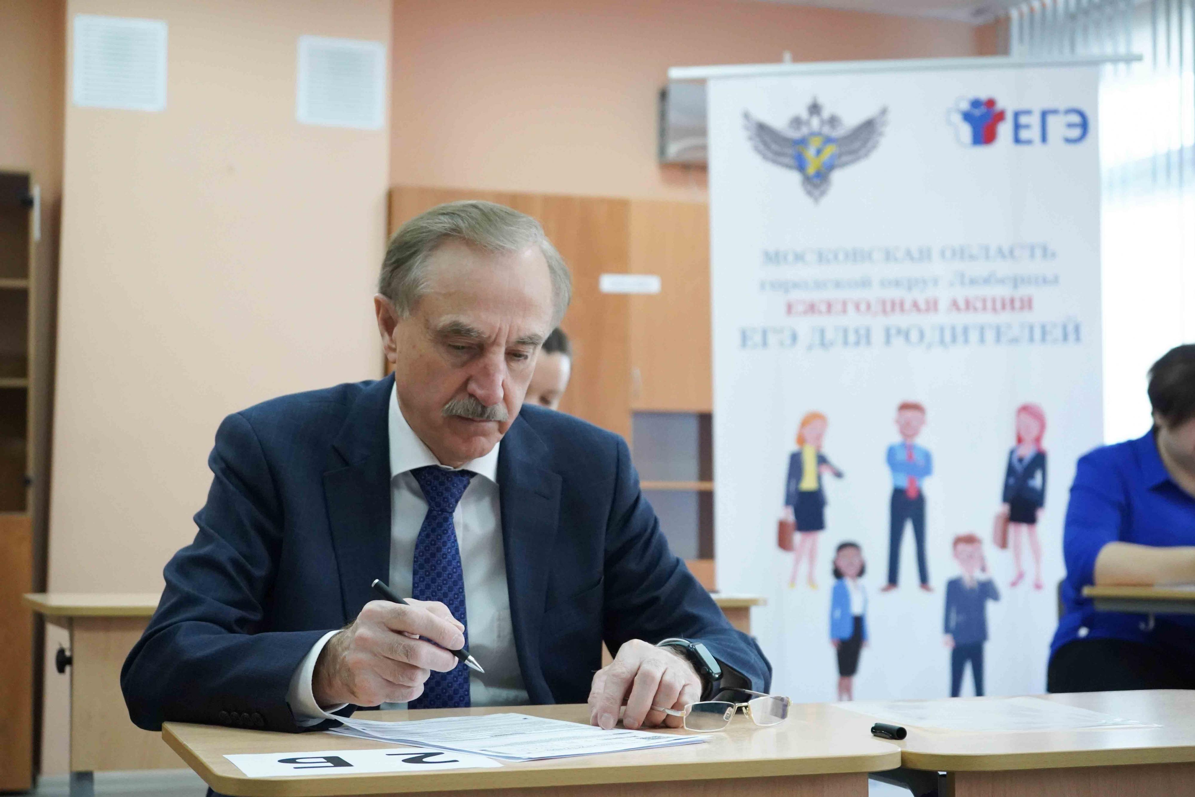 Глава городского округа Люберцы Владимир Ружицкий проверил свои знания по русскому языку в рамках всероссийской акции «Единый день сдачи ЕГЭ родителями», которая прошла в среду в Кадетской школе.