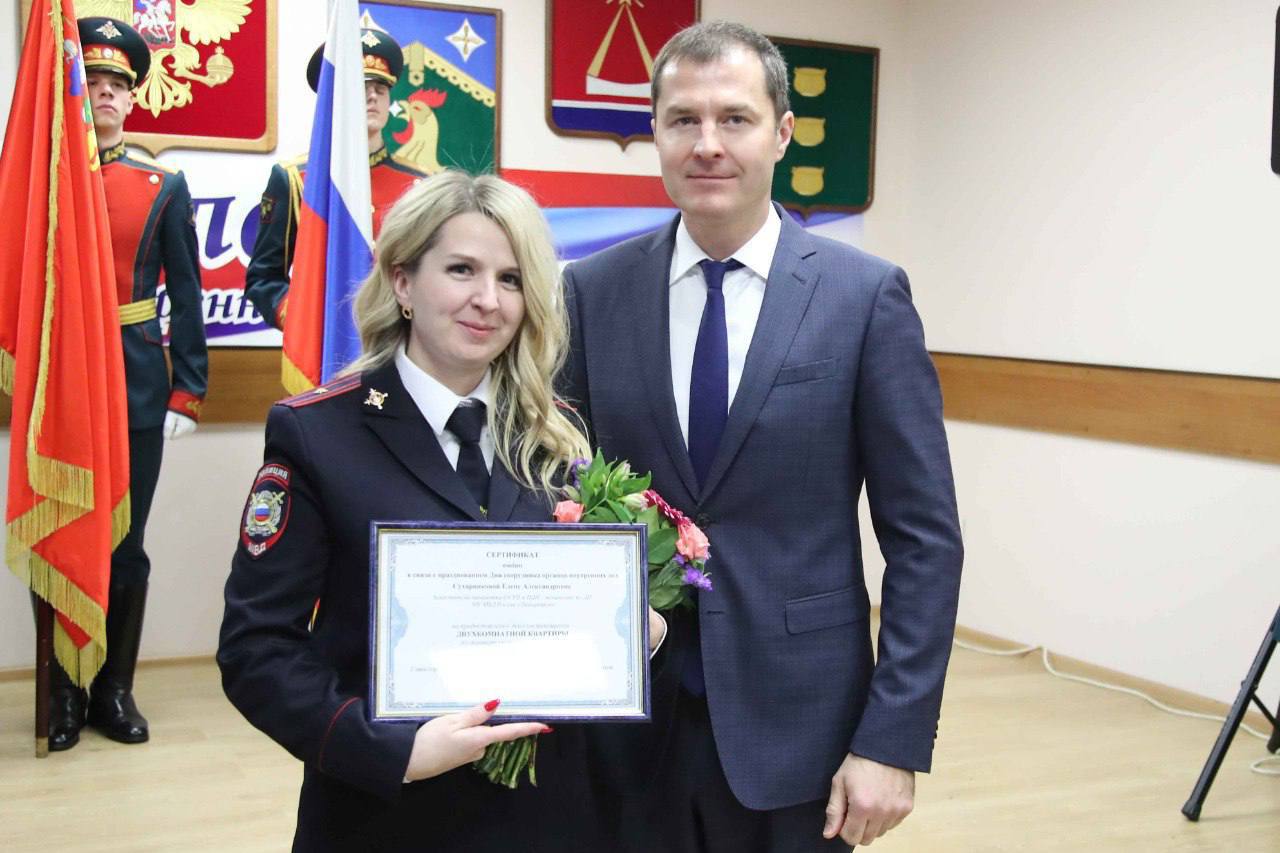 Глава городского округа Люберцы Владимир Волков в четверг поздравил с профессиональным праздником сотрудников органов внутренних дел и вручил им семь сертификатов на жилые помещения.