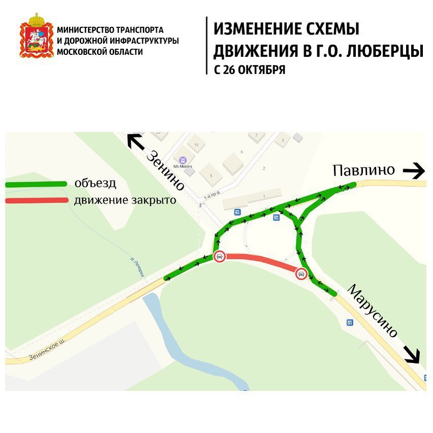 Движение будет осуществляться по временной автодороге параллельно участку дороги «Марусино-Зенино» с поворотом на автодорогу «Зенино-Павлино».