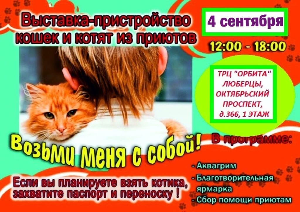 «Приглашаем горожан посетить выставку-пристройство кошек и котят из приютов г. Люберцы «Возьми меня с собой!» 4 сентября, в субботу. В этот день можно выбрать себе домашнего питомца (для этого необходимо взять паспорт и переноску) или просто полюбоваться животными и принести им лакомства и подарки», - говорится в сообщении.
