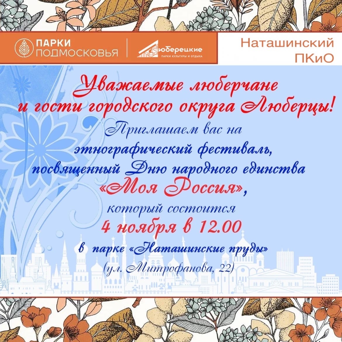 «4 ноября наша страна отмечает День народного единства. Наши парки и учреждения культуры подготовили для гостей и жителей округа много интересных и познавательных мероприятий, на которых можно познакомиться с культурой и традициями народов России. Центральной площадкой празднования станет Наташинский парк, здесь в 12.00 начнется этнофестиваль «Моя Россия». В Центральном парке в 17.00 – концертная программа. В Малаховском парке жителей ждут увлекательные тематические мастер-классы и викторина, литературная программа», - отметил Волков.