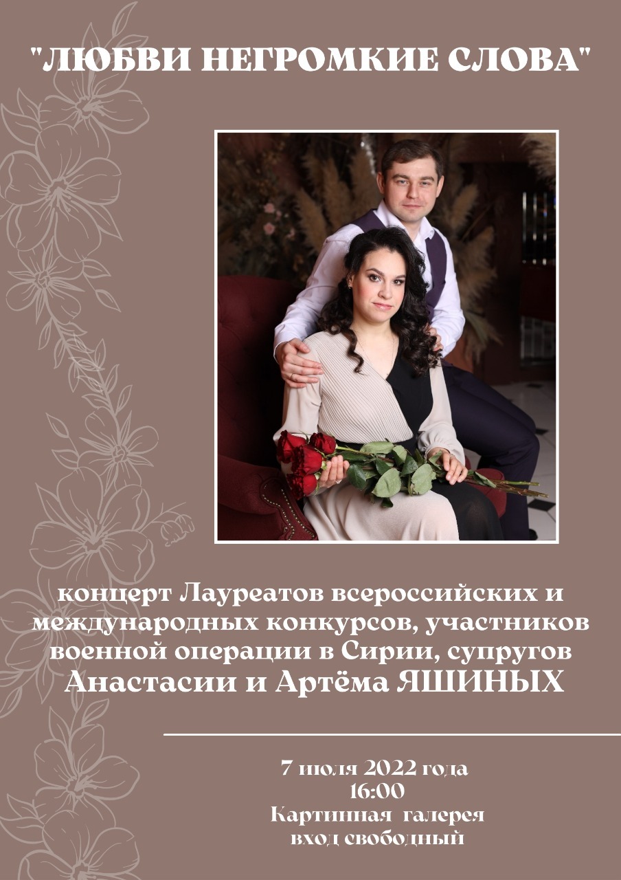 В Люберецкой картинной галерее 7 июля, в преддверии Дня семьи, любви и верности, состоится бесплатный концерт лауреаты всероссийских и международных конкурсов Анастасии и Артема Яшиных «Любви негромкие слова», сообщили в комитете по культуре муниципалитета.