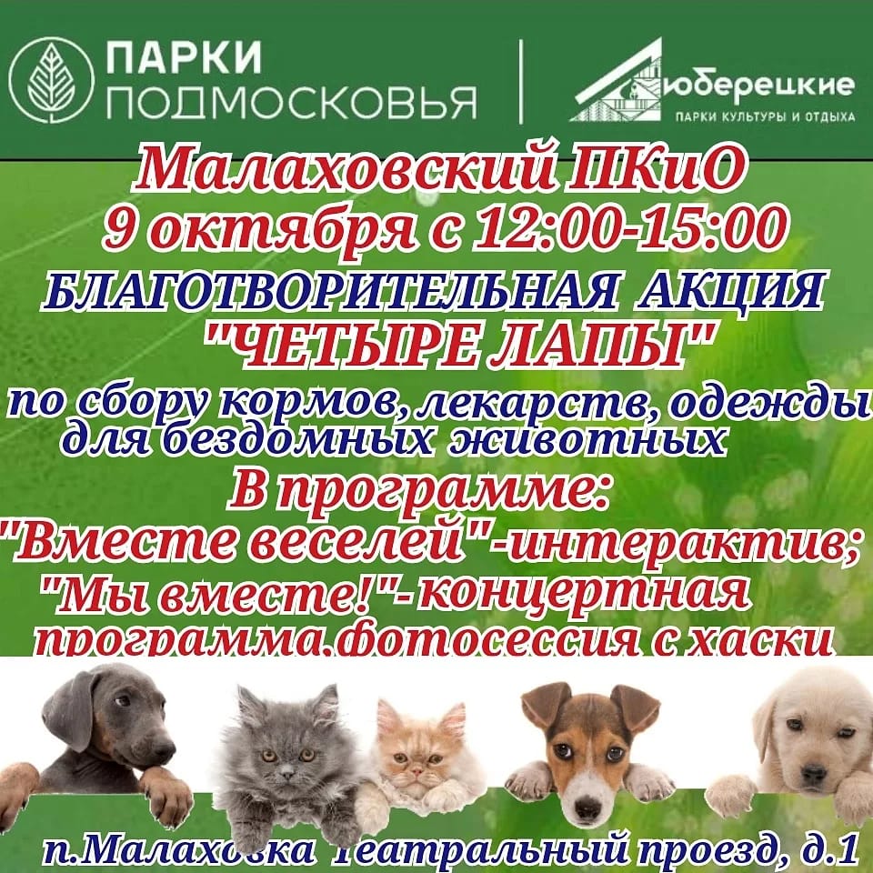 «Трепетное и заботливое отношение к нашим четвероногим друзьям является нашей обязанностью во всех смыслах этого слова. 9 октября с 12.00 до 15.00 приглашаем принять участие в благотворительной акции «Четыре лапы» по сбору кормов, лекарств, одежды для бездомных животных, приуроченной к Всемирному дню защиты животных. Мероприятие состоится в Летнем парке в Малаховке по адресу: Театральный проезд, дом №1», - отмечается в сообщении.