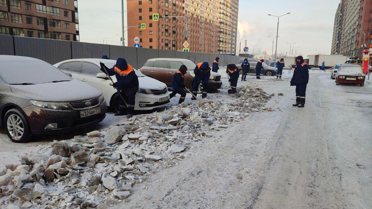 В округе продолжаются работы по уборке дворовых и общественных территорий. Проводится ручная и механизированная очистка от снега и наледи, а также обработка территорий противогололедными материалами.